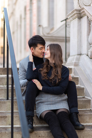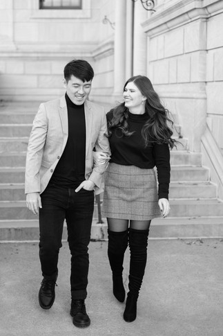 In the chilly winter months of Minnesota when the trees are bare, I love using the beautiful architecture of the Twin Cities as my backdrop. The elegant George Latimer Library in Saint Paul made for a classy location that fit perfectly with the outfits that Katrina & Leon had picked out. Even though it was chilly outside, you can’t tell at all from their candid smiles! Fortunately, we were also able to make use of the beautiful golden staircase inside the library for a few photos out of the cold.